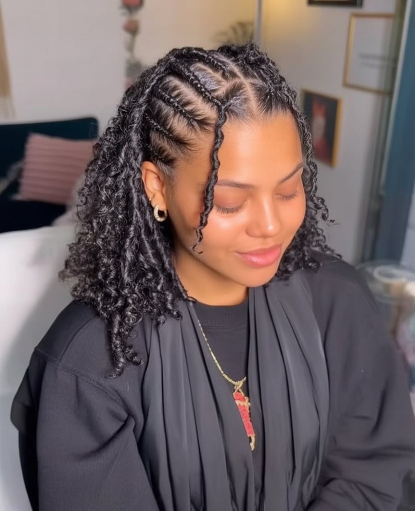 For styling tips, treat the braids like the foundation and the curls like the statement. This works great with a weave if you want fuller curls or a little extra length, and it’s especially friendly for fine hair that needs added volume. Use mousse on the braid base for hold, then a lightweight curl cream on the loose pieces to keep them bouncy without crunch. Wrap the top with a scarf at night and pineapple the curls so you wake up looking ready for 2026 without a full redo.