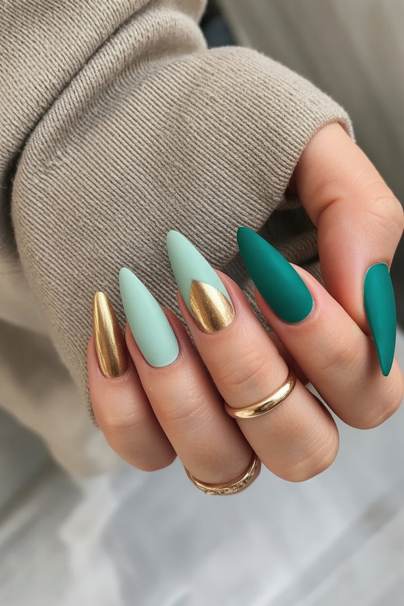 The blend of mint, teal, and gold is one of those nail art designs that will automatically turn you into the cool friend of the party, whether that party is in your living room or at a nightspot on Friday night. Green and gold paired create a refreshing, natural look, and then some gold thrown into the mix gives just enough pop, but nothing too overwhelming, thanks to its matte finish and combined color choices.