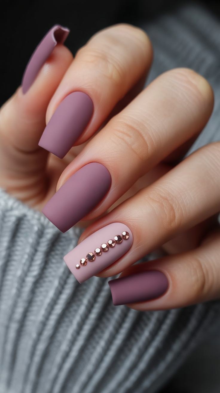 These mauve matte nails feel soft and romantic, like a favorite knit scarf on a cool afternoon. The muted purple-pink base is flattering and chic, while the single nail lined with rose-gold studs adds just the right amount of sparkle. It’s feminine without being fussy, and it catches the light beautifully when you move your hands.