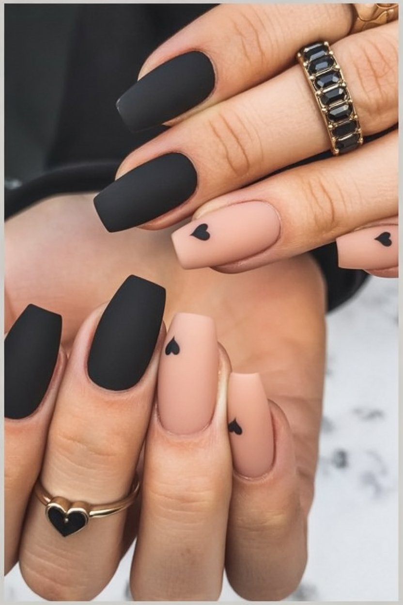 These mauve matte coffin nails have that ‘I woke up like this’ kind of polish—it’s soft, feminine, and confidently subtle all at once. It falls exactly between pink and purple, meaning that it’ll complement all skin types, and paired with your favorite accessories, it’ll look like you planned that statement*. And combined with its soft finish and bold shape, this mani is like a little stylistic armor that you get on before heading out into your world of brunch, meetings, or tonight’s date night, and of which you can’t help but be quietly nervous and turned on. Mauve is one of those colors that is easily dressed up or down, and that’s why it’s always popping up in matte nail art inspiration for 2026 that’s elegant enough for any formal occasion. To create a whole outfit from this collection that requires little to no effort, all you need is some dainty gold rings, a soft knit sweater, and perhaps some pink lip color, and you’ll be all set. And as a part of a more formal wardrobe, it matches just fine beside a black dress and some high heels, or as a more casual look, it adds some intention beside jeans and a basic tee. Matte nails truly are one of those details that count as small changes that can have a huge impact. Whether you’re into pastel colors, statement dark red, blue hearts, or going all out and short and black, there is going to be one of these that can easily be added into your arsenal of daily activities that won’t go against functionality and comfort.