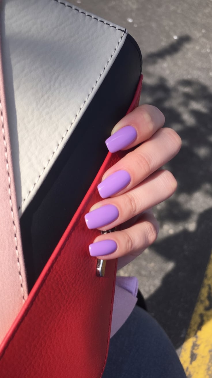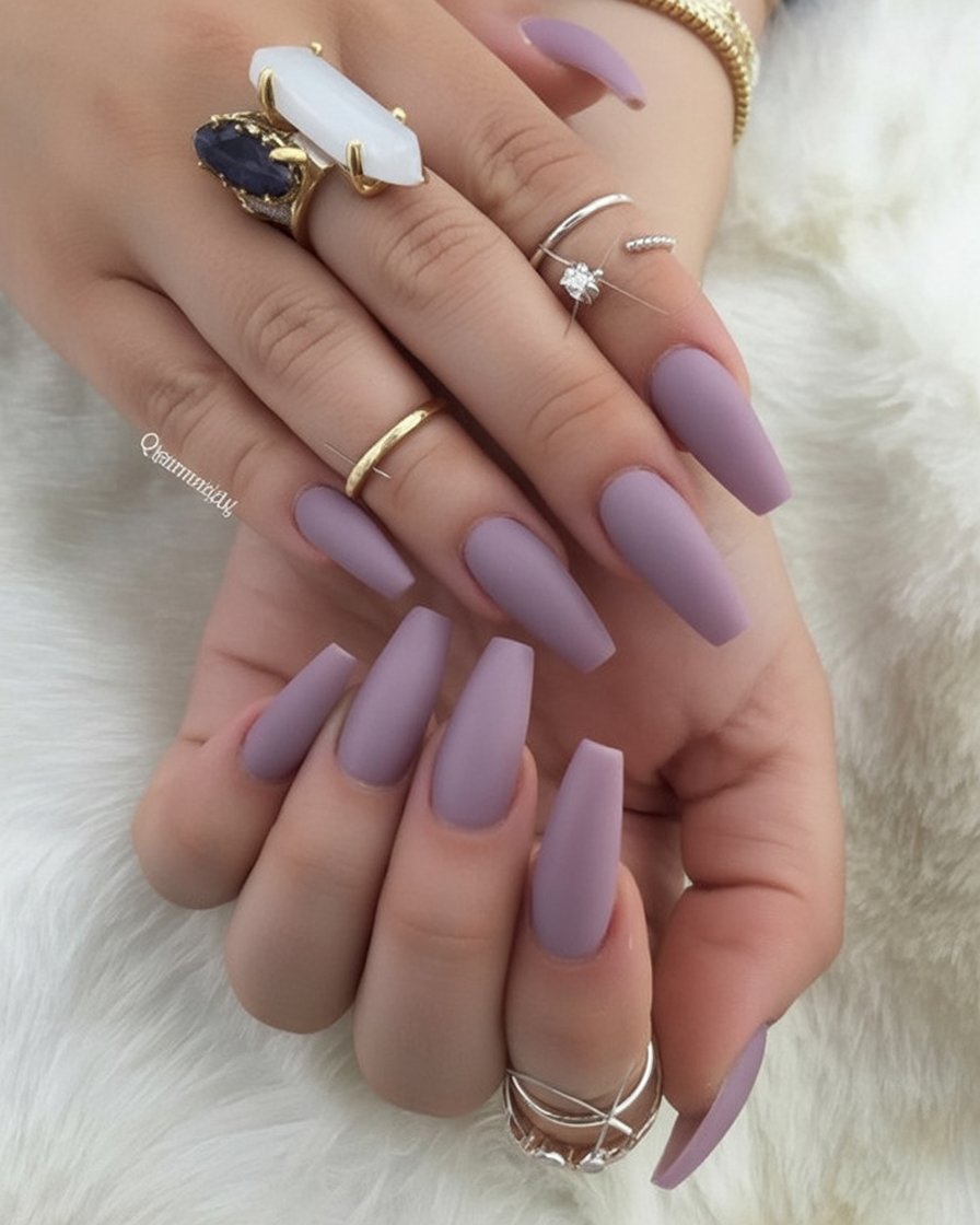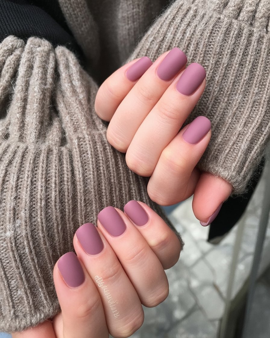 Nails that are this color and shape hit all of your senses—the way they feel, smell, and look—exactly as you need them, and they’re all actually good for you, too, as they won’t be getting all worn and battered because of that rounded shape and that matte purple color, of course, that just gives them a little flavor, a little panache, and helps them pop when they’re reflected back at you as you’re facing your car or, for example, reaching for your
