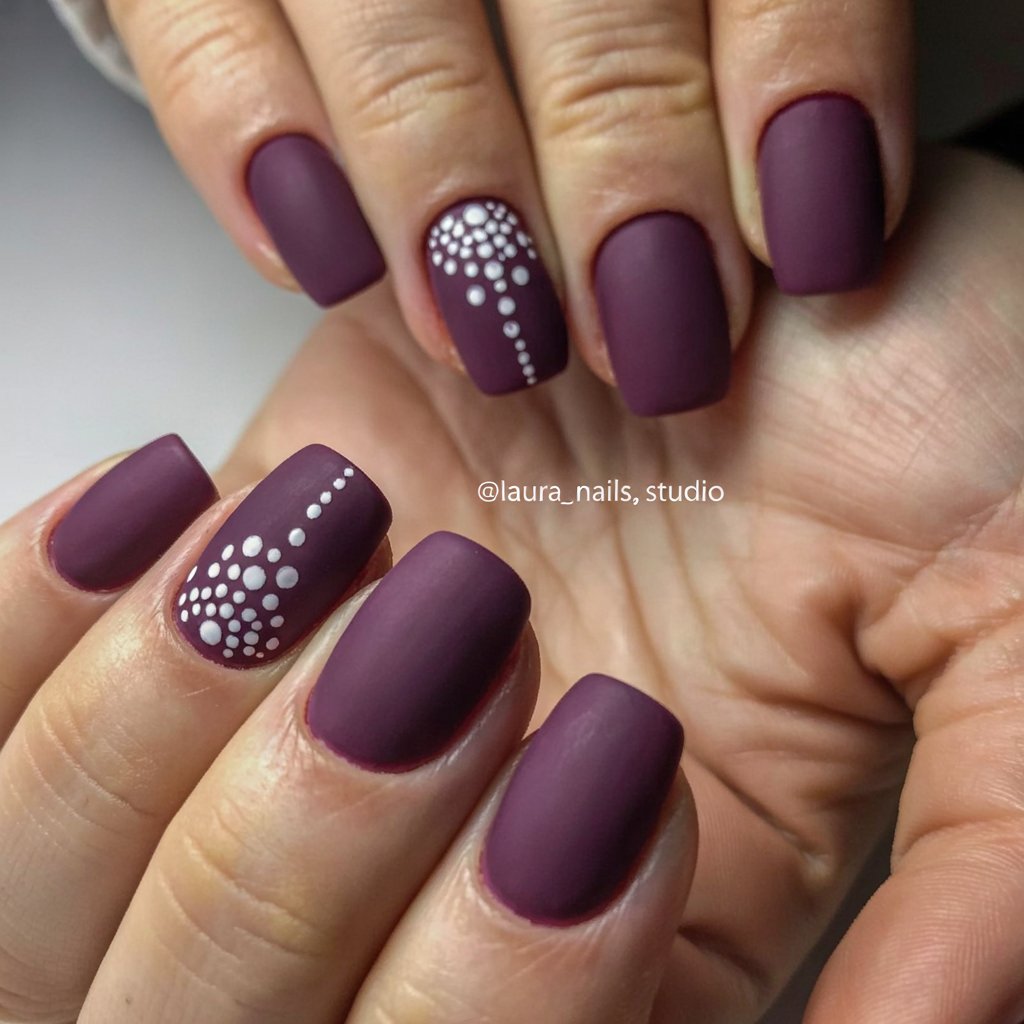 Plum matte nails may be as rich and elegant as they come, but pair them up with some little dots, and all of a sudden, you have a party on your fingertips! Plum nails feature a deep, dark purple color that is as plush and comfortable as it is sophisticated, and it features a little pop of white that says, “I’m still a party girl, thank you very much! ”