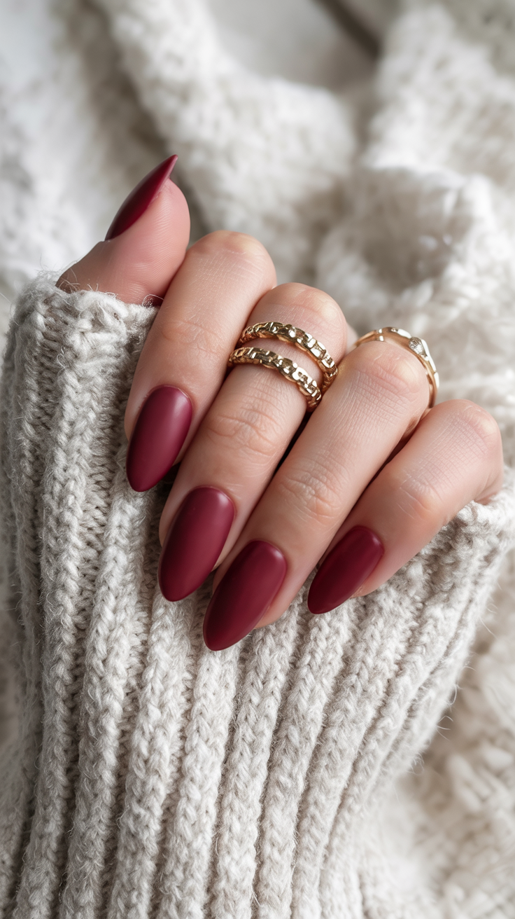 If you like deep, bold colors, these burgundy nails feature that same feeling of what it is like to snuggle up and have a glass of red wine and a warm, comfy blanket. Even this matte finish will help reduce just how bold this color is, making this more of a velvety, expensive look and less of a bold statement look when combined with that sweater and some gold rings on your fingers.