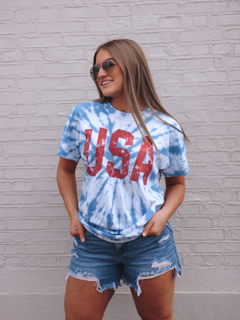Tie-dye is making a comeback, and this cute blue-and-white USA graphic tee is a fun and modern take on the trend. Paired with frayed denim shorts, this look is ideal for teens and women casual wear lovers alike.