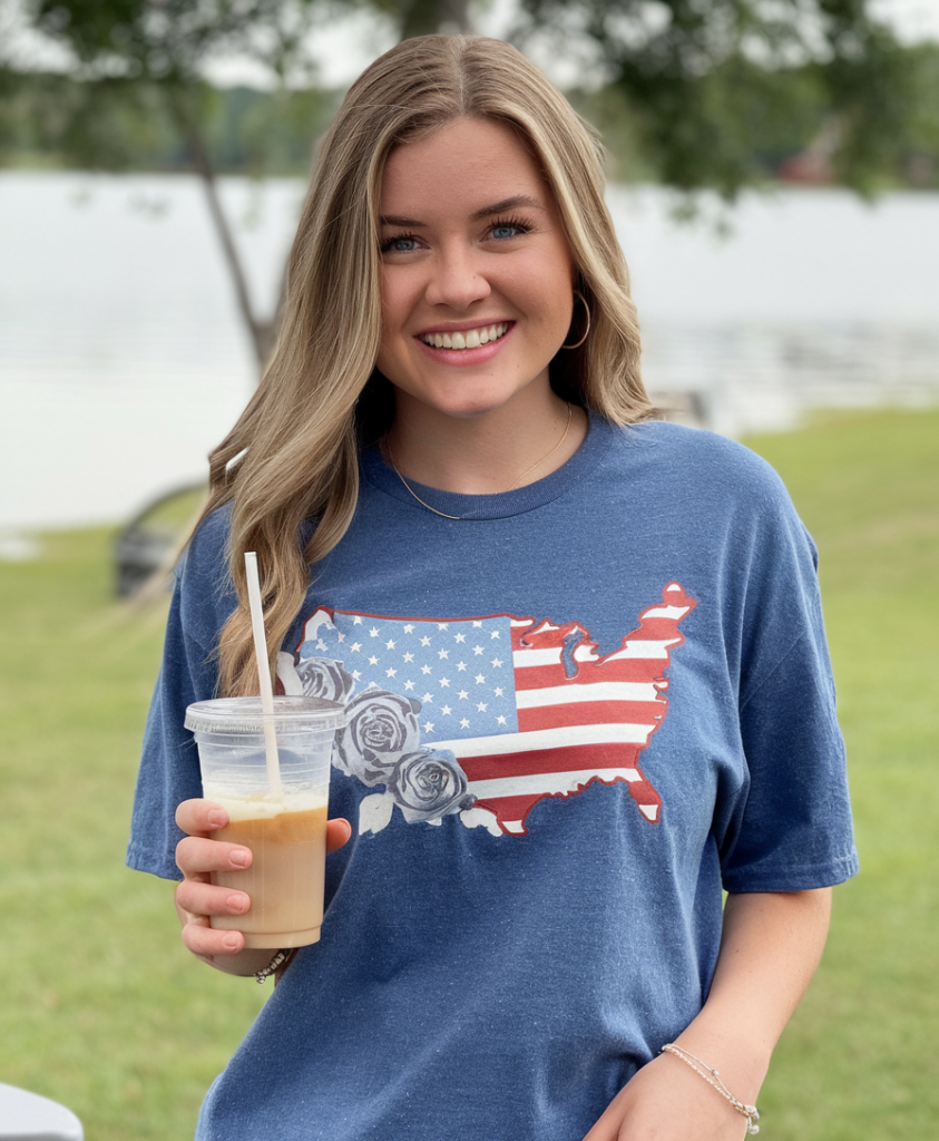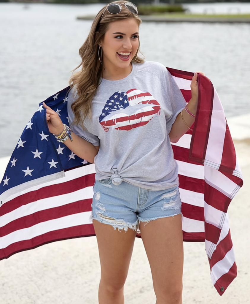 This relaxed blue tee featuring an American flag print across the U.S. map is a plus size friendly option for a comfortable yet festive look. Worn loosely over light-wash denim shorts, this outfit embodies effortless women’s inspo for a Memorial Day outfit.