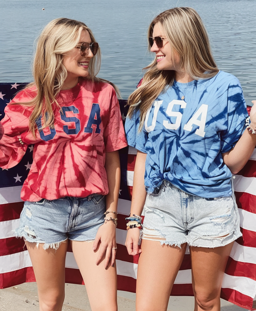 Best friends or sisters will love this duo look featuring bold, oversized USA tie-dye tees in red and blue. Worn over distressed denim shorts, these outfits scream women summer fun and are perfect for outdoor celebrations.