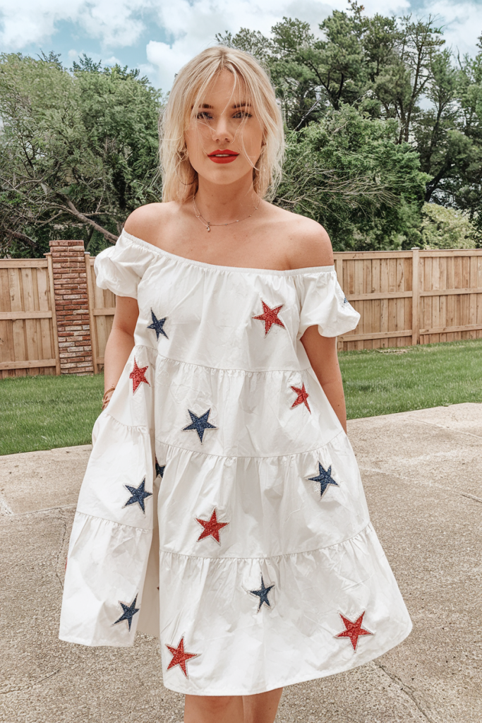 A breezy cute off-shoulder white dress adorned with embroidered red and blue stars is an effortlessly chic women summer pick. The flared silhouette and ruffled sleeves bring a soft and feminine touch, making it ideal for a dressier Memorial Day event.