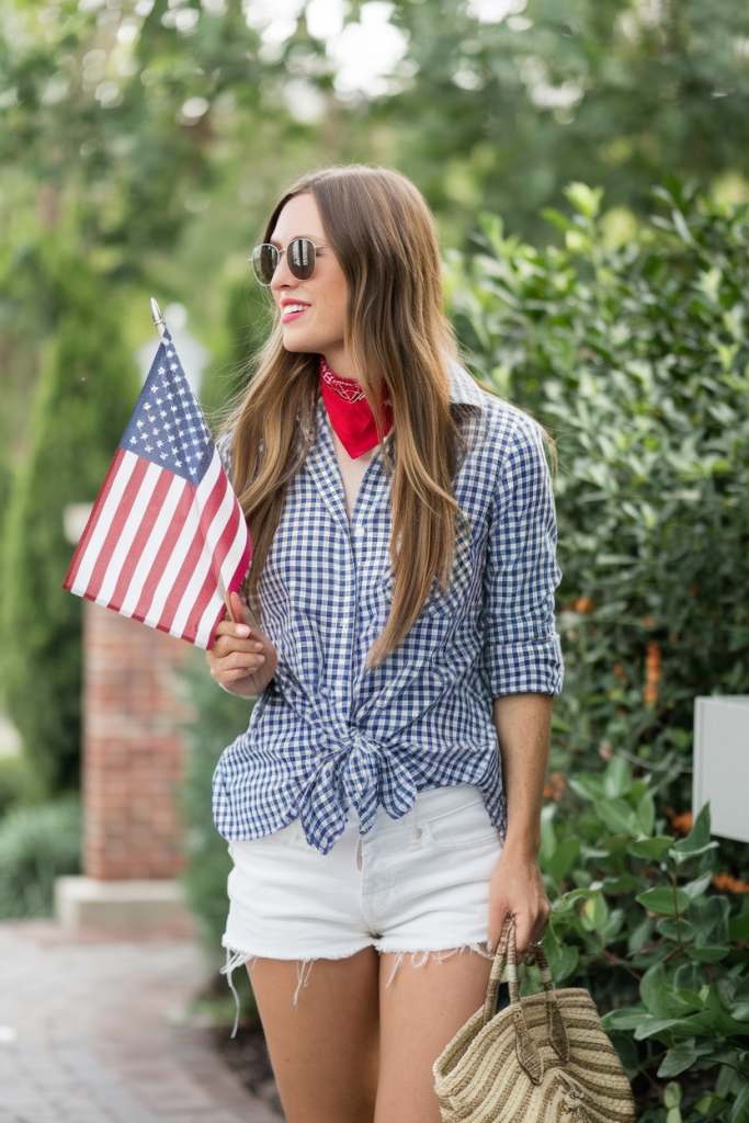 A blue gingham button-down shirt knotted at the waist paired with crisp white shorts embodies women’s inspo for a polished yet laid-back Memorial Day outfit. The red bandana around the neck injects a pop of color, making this an ideal women classy look for a picnic or a casual day out.