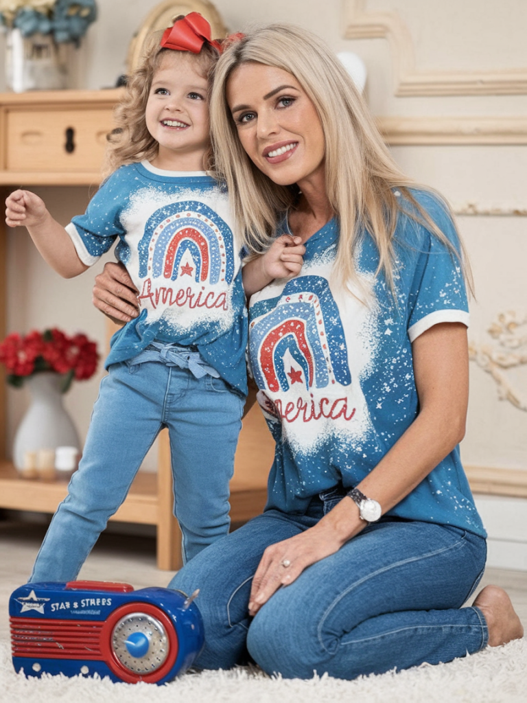 This women casual and kids matching red, white, and blue tie-dye tee set is an adorable way to celebrate Memorial Day as a family. Paired with classic denim shorts, it’s an easy, comfortable, and photogenic outfit.