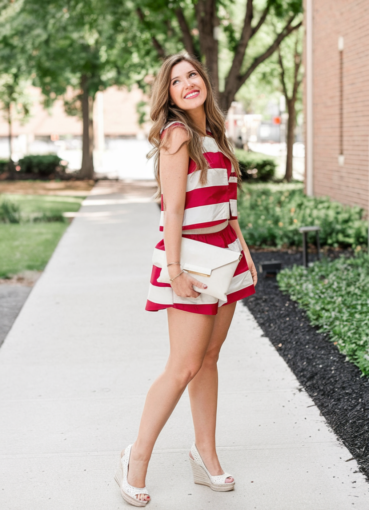 For those who love a cute and feminine approach, a red-and-white striped two-piece set is a must-have for Memorial Day 2025. The cropped top and high-waisted shorts combination is both breezy and modern, making it ideal for summer’s early heat.