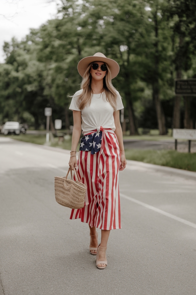 A red-and-white striped wrap skirt with an American flag accent creates a stunning statement piece, especially when paired with a simple white tee and neutral-toned accessories. The wide-brim hat and woven bag exude preppy elegance, perfect for an outdoor brunch or parade.