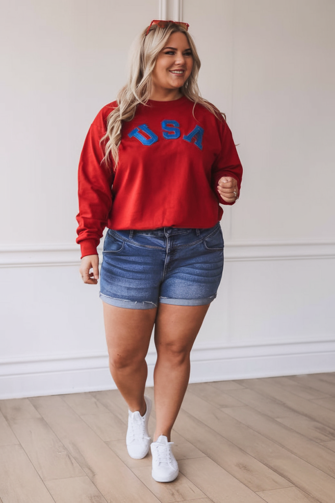 For a plus-size friendly take on women casual wear, a relaxed-fit red sweatshirt with “USA” embroidery paired with dark-wash denim shorts offers both comfort and festive spirit. This look is ideal for a cool evening by the firepit or a relaxed day with family.
