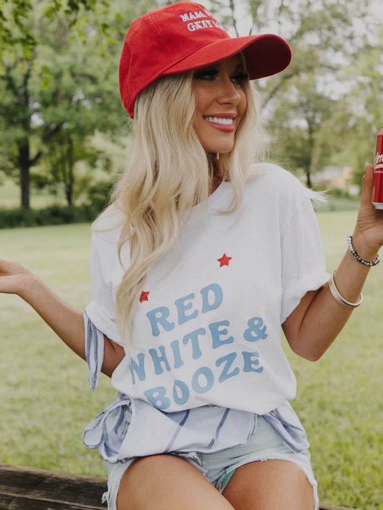 A women summer favorite, a playful graphic tee tied at the waist paired with light-wash denim shorts offers a fun and effortless approach to Memorial Day 2025. The red baseball cap adds a sporty flair while keeping the sun at bay.