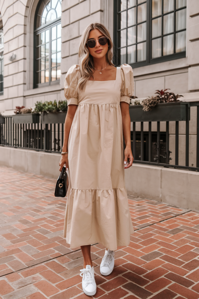 Soft neutral tones and a relaxed silhouette make this midi dress a staple for those who love classy chic styles. The square neckline and puff sleeves add a vintage yet modern touch, making it perfect for spring or fall outings. Styled with white sneakers, this look balances sophistication and comfort, ideal for an effortless city stroll or a coffee date.