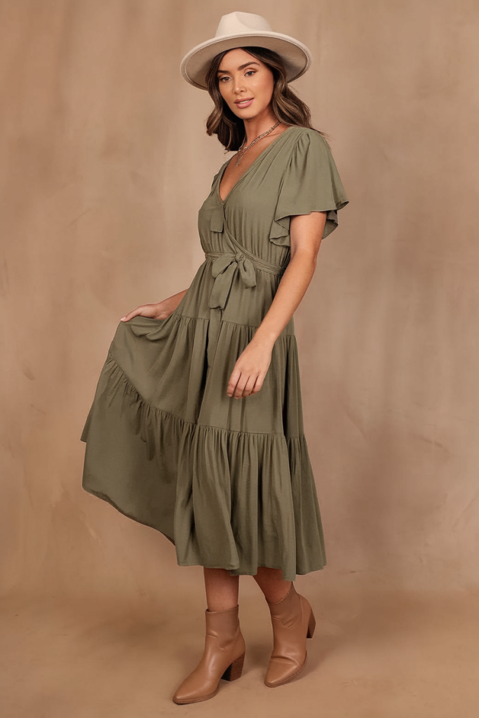 This green tiered midi dress brings a classy modest fashion touch with its flowy design and linen-like texture. Styled with brown ankle boots and a structured hat, it’s the ultimate go-to for a fall countryside escape or a rustic-inspired brunch.