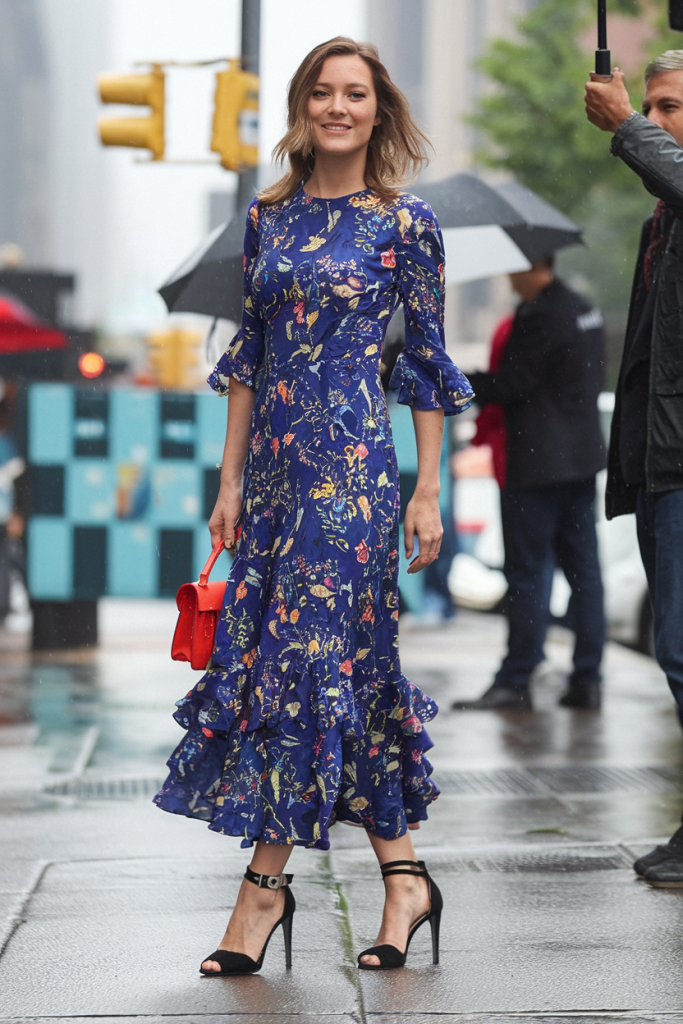This blue printed midi dress is a head-turner, perfect for city outings or an outdoor event. The ruffle hem and sleeve details add a sense of playfulness, while the structured fit maintains a classy and put-together look. A pop of color is introduced through the red handbag, tying the outfit together seamlessly.