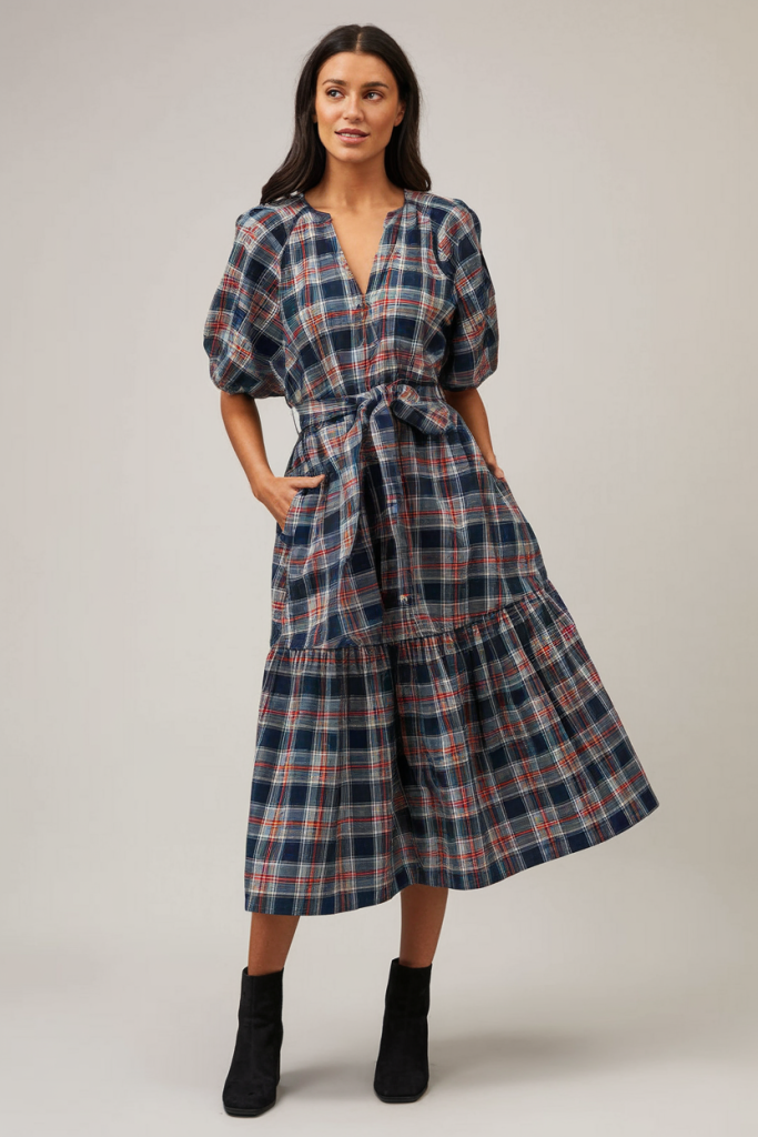 Plaid is back in 2025, and this flannel midi dress blends tradition with modern appeal. The cinched waist, structured sleeves, and rich color tones make it an excellent transitional piece for fall and winter. Styled with black ankle boots, this look embodies classy chic with a casual twist.