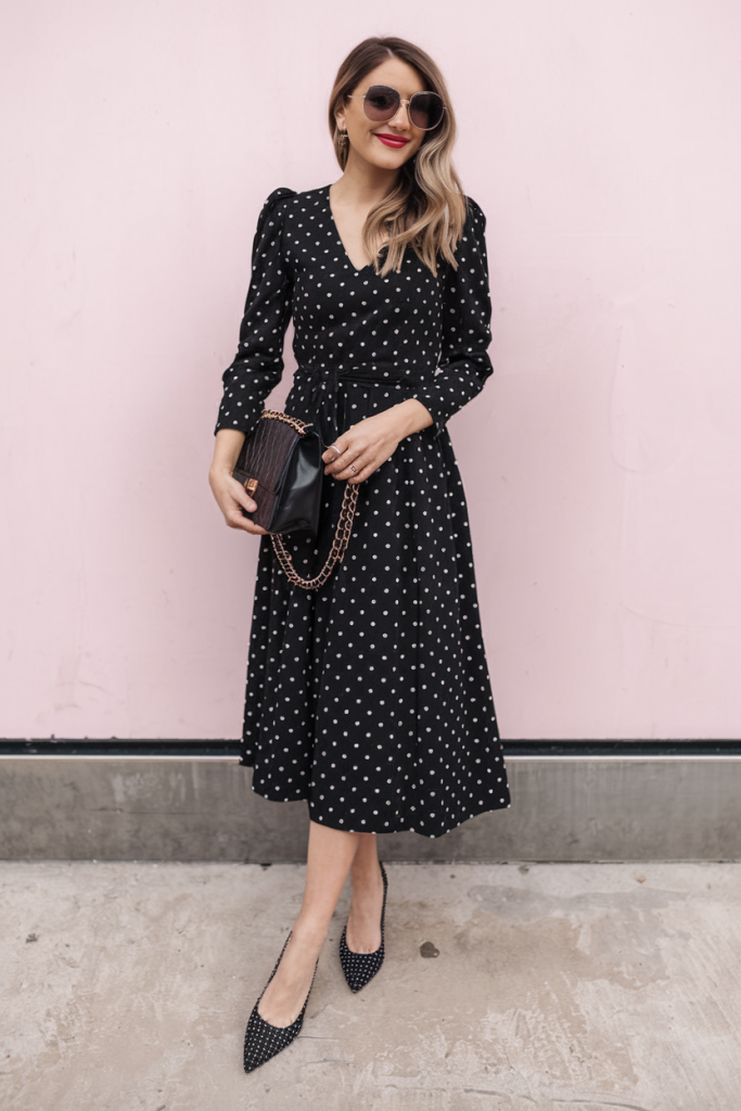 Nothing says classy like a black and white polka dot midi dress. This long-sleeved, cinched waist piece is a flattering choice for any body type, exuding both vintage charm and modern sophistication. The addition of a quilted leather bag and pointed heels makes it an ideal pick for a business lunch or a chic night out.