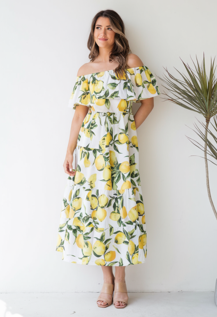 A white off-the-shoulder floral midi dress featuring vibrant yellow lemons is the ultimate summer staple. The cotton fabric makes it breathable and easy to wear, while the tiered skirt adds a touch of playful movement. Nude sandals complement the lightness of the outfit.