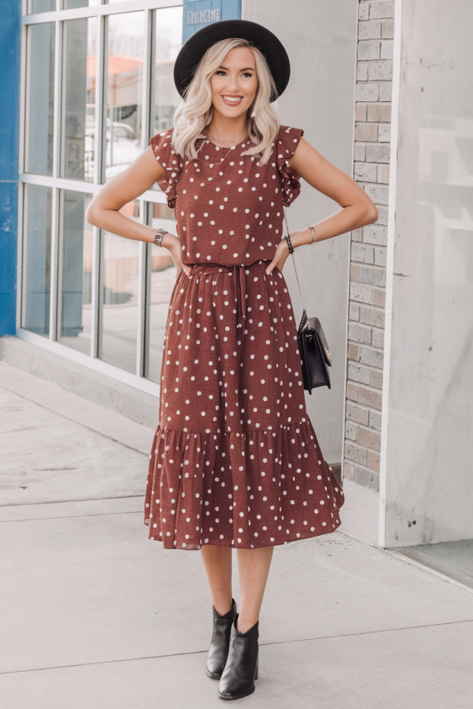 A brown polka dot midi dress with a cinched waist and flutter sleeves is the perfect combination of classy chic and casual comfort. The addition of a black hat and ankle boots adds a touch of vintage charm, making this an effortless look for spring or fall.