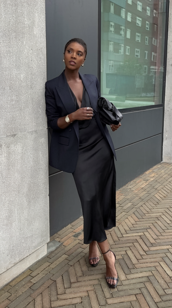 This black satin midi dress, layered with a structured blazer, is the epitome of classy sophistication. Ideal for a corporate event or an evening dinner, this outfit radiates confidence and grace. The minimalist accessories and strappy heels complete the look effortlessly.
