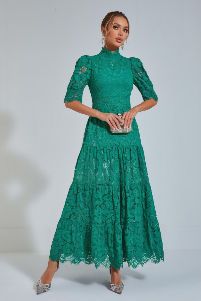 A green lace midi dress with high-neck detailing and a structured bodice creates a regal and polished aesthetic. This outfit is perfect for winter galas, weddings, or sophisticated evening events. The silver heels and sparkling clutch add a finishing touch.