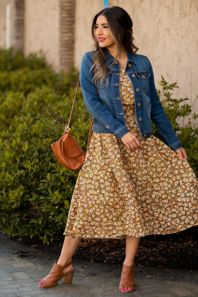 Nothing screams spring and summer quite like a floral midi dress. This brown, yellow, and beige print embodies effortless femininity, enhanced by the denim jacket, which gives it a laid-back yet stylish vibe. The brown crossbody bag and open-toe heels complement the earthy tones, making this an easy go-to outfit for weekend outings.