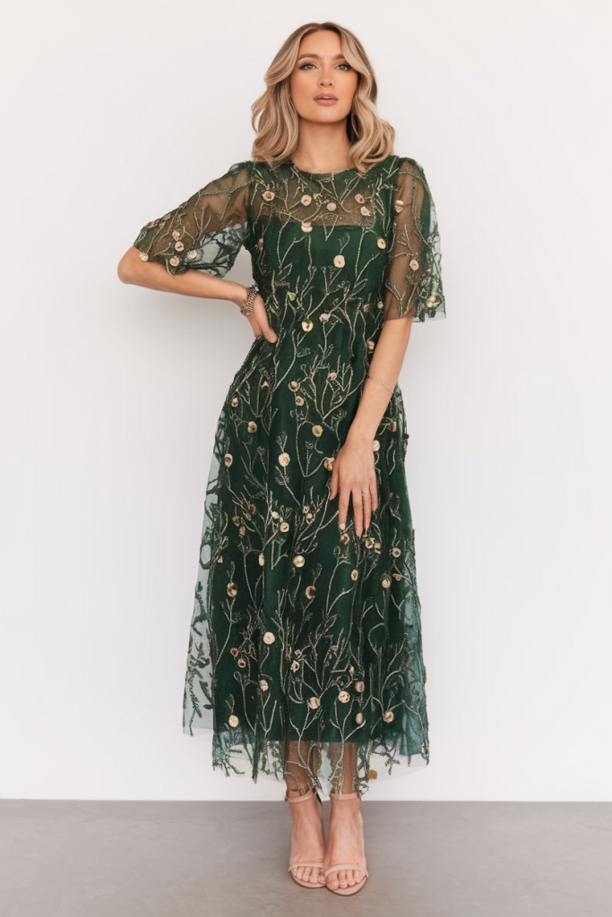 This dark green mesh midi dress, adorned with intricate floral embroidery, offers a classy modest fashion statement. The sheer sleeves and flowy skirt add a romantic touch, making it an ideal pick for a special occasion or an elegant dinner.