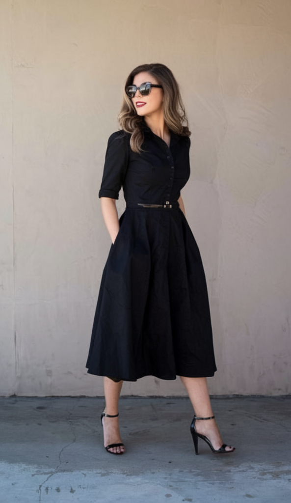 A black button-up midi dress with a cinched waist and A-line silhouette is a wardrobe staple for those who love timeless fashion. Styled with black heels and oversized sunglasses, this look embodies effortless elegance, perfect for spring, fall, and winter.