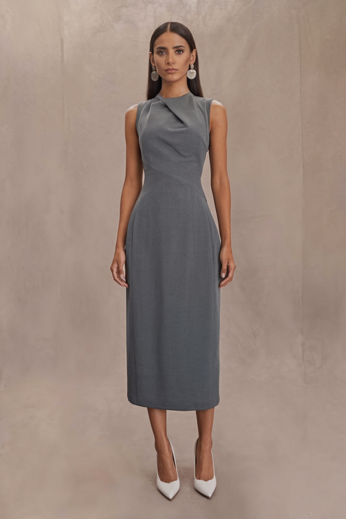 A grey sleeveless midi dress with an asymmetric neckline and tailored fit offers a modern take on minimalist elegance. The fitted silhouette makes it perfect for business settings or upscale dinners. Styled with white heels, this look is sharp and contemporary.
