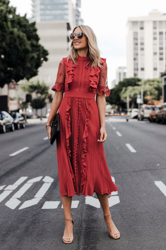 This red ruffled midi dress is an eye-catching statement piece for special occasions. The delicate lace detailing and structured bodice add depth and femininity, making it perfect for an elegant evening out or a cocktail event.