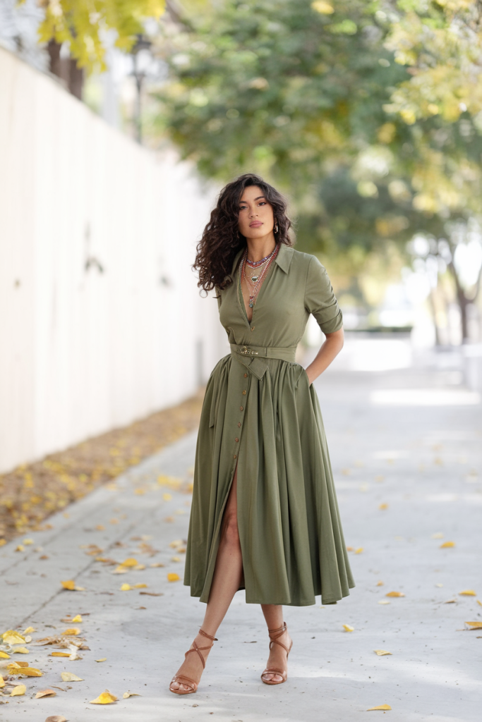 A deep green button-up midi dress exudes confidence and timeless elegance. The structured design with a cinched waist highlights an hourglass figure, while the subtle slit adds a touch of allure. Layered necklaces and gold accessories further enhance the sophistication of this outfit, making it perfect for evening events.