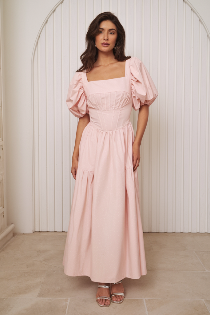 Soft pink hues combined with lace and corset detailing make this midi dress ideal for those who adore classy chic fashion. The puff sleeves and flowing tulle skirt add an ethereal touch, making this perfect for spring events like weddings or garden parties.