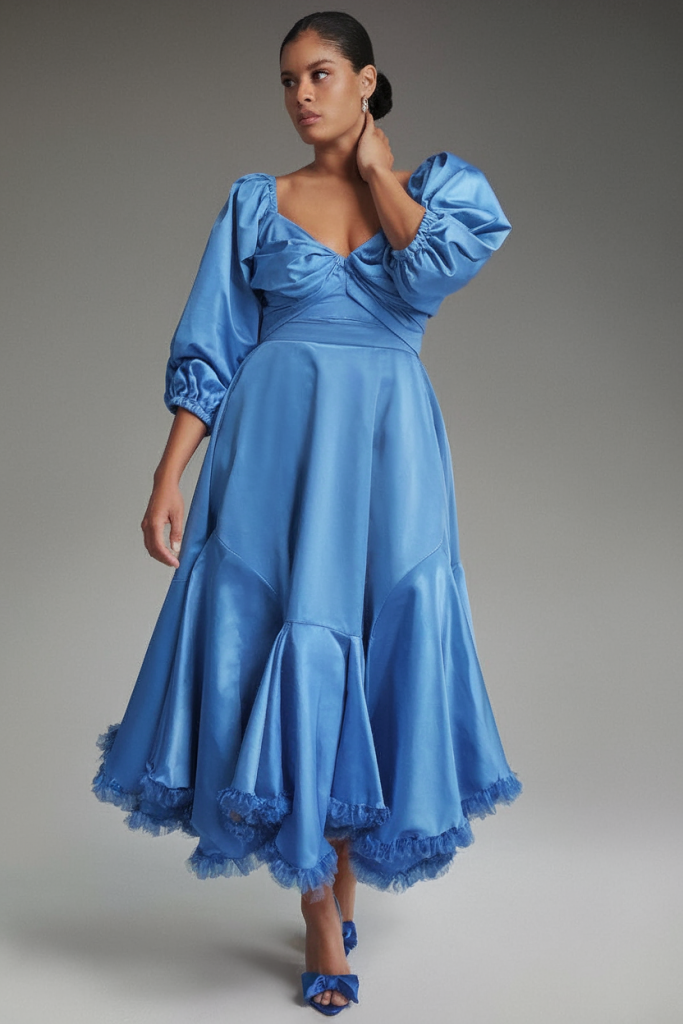 This blue satin midi dress exudes drama and sophistication. With its voluminous sleeves and ruched bodice, it is an excellent choice for special occasions where you want to stand out. The velvet trim and delicate lace detailing at the hem add a regal touch, making it red carpet-worthy.