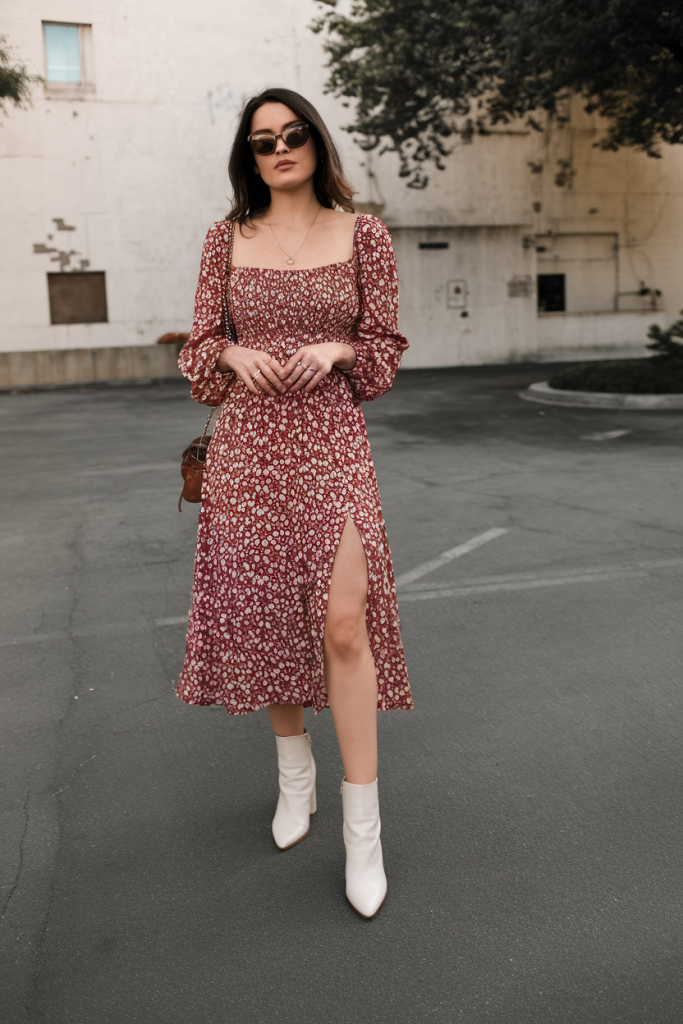 A floral midi dress with puff sleeves and a high slit exudes romance and effortless femininity. Styled with white ankle boots and a small crossbody bag, this look is perfect for an early fall outing or a stylish spring date. The subtle red and white print makes this a standout piece, offering a classy yet casual aesthetic.