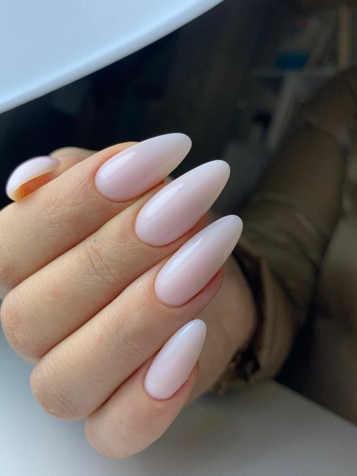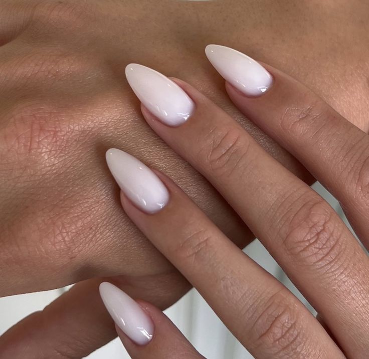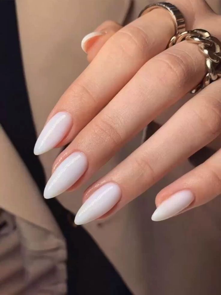 This nail style features a delicate almond shape, offering a sleek and feminine silhouette that elongates the fingers. The high-gloss gel polish in a milky white shade provides a smooth, reflective surface that is both understated and chic. With its natural sheen and flawless finish, this look is perfect for anyone who wants elegance without excessive embellishments.