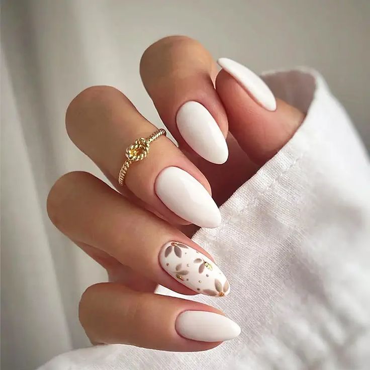 These almond-shaped nails take creativity to the next level with floral-inspired nail art. Featuring one accent nail with intricate gold floral patterns, this design is perfect for special occasions like weddings or formal events. The matte milky white base provides a lovely contrast to the detailed artwork.