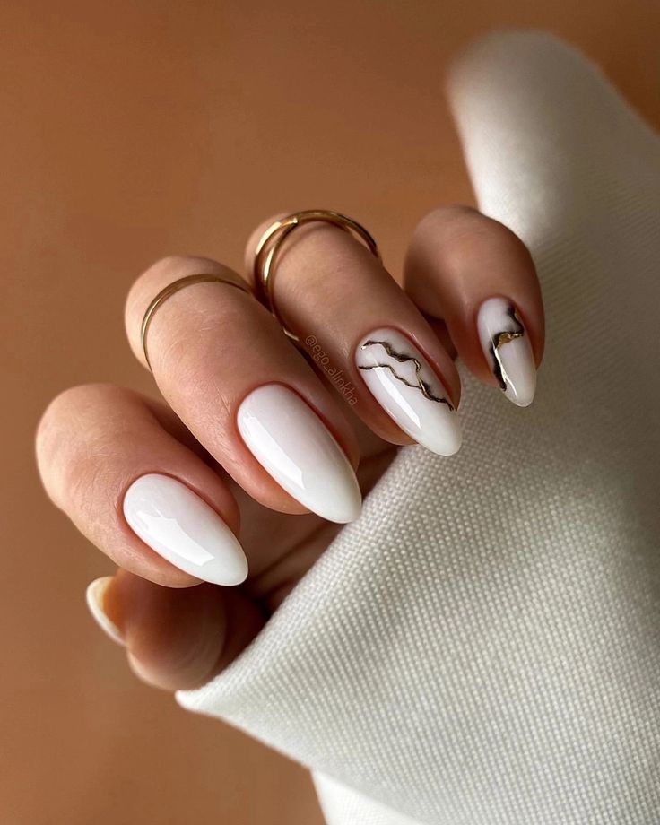 Almond-Shaped Milky White Nails with Gold Accents