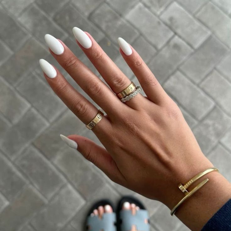 This almond-shaped nail set epitomizes minimalist luxury, enhanced by an impeccable high-gloss gel polish finish. The creamy white tone contrasts beautifully with the bold gold accents, including chic stacked rings and a modern bracelet shaped like a nail. The elongated shape of these nails not only flatters the hand but also adds a touch of sophistication to any outfit.