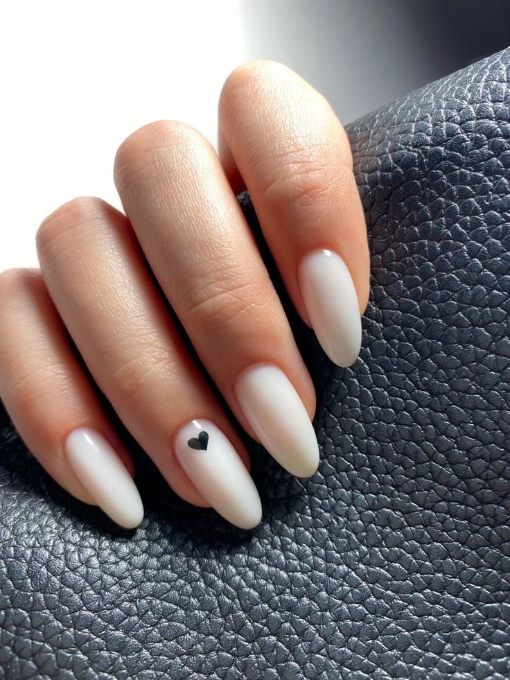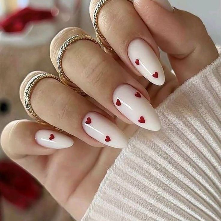 For those looking to express a playful side, this design incorporates small red heart accents over almond-shaped milky white nails. This style exudes charm and creativity, making it perfect for Valentine’s Day or any romantic occasion. The hearts add a fun twist to an otherwise classic nail, creating a unique nail art moment.