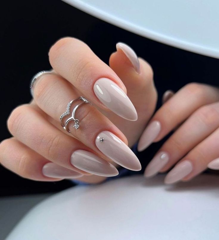 These almond-shaped nails showcase a glossy nude finish with a single gem accent for a sophisticated yet minimalistic look. Perfect for summer 2025, this design highlights the natural beauty of nail shape while adding a touch of glamour. Ideal for weddings, office wear, or a casual day out, this design embodies effortless chic.