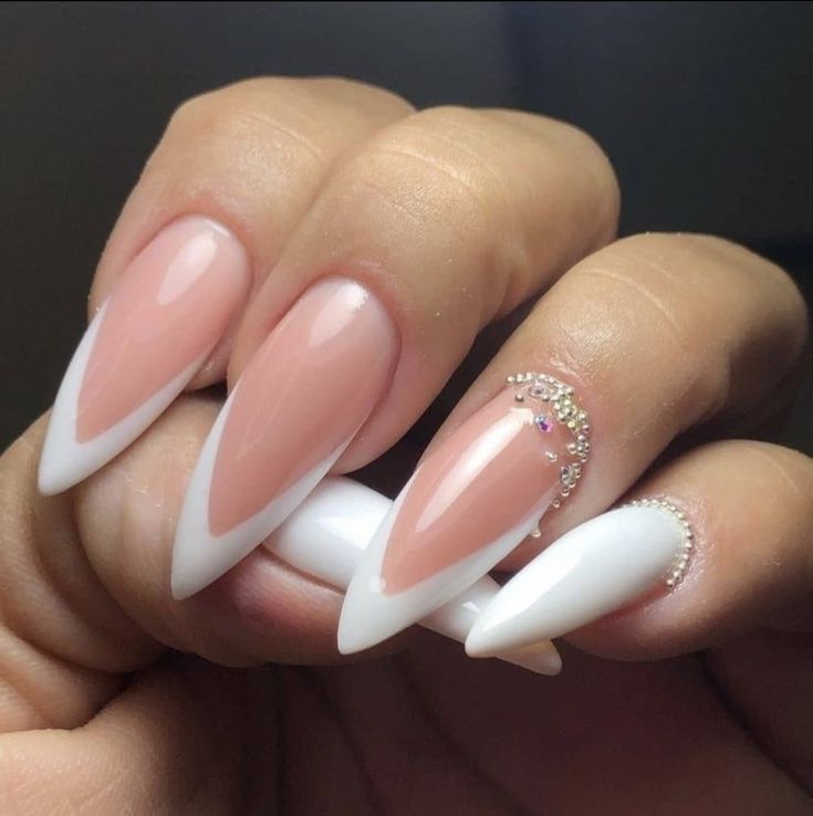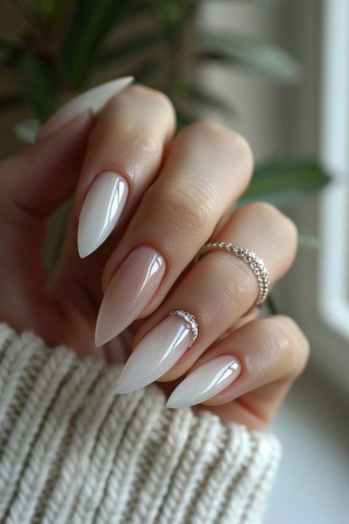 Recreate this style using acrylic nails and a glossy white polish. Apply rhinestones near the cuticle for an extra touch of glamour, ensuring durability with clear adhesive.