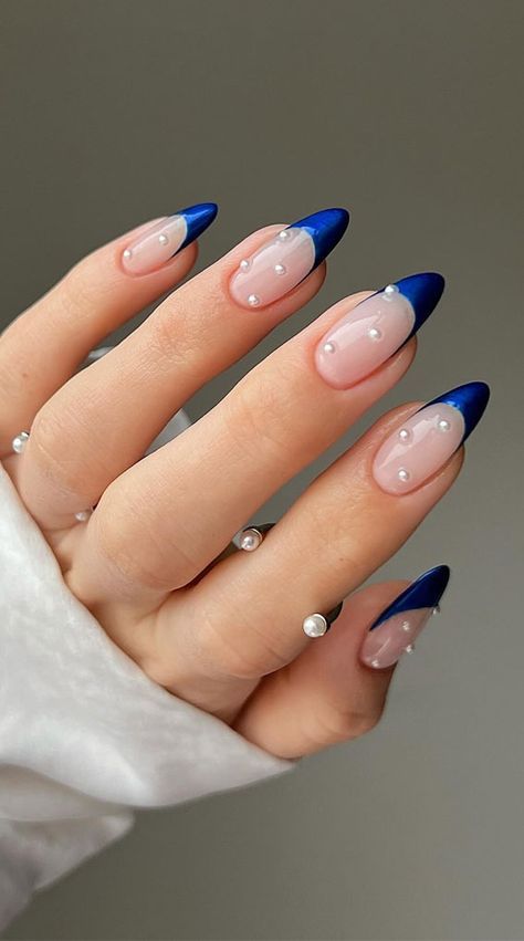 Bold Blue French Tips with Pearls