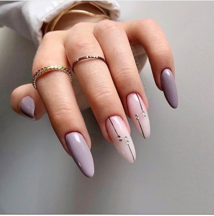 This delicate manicure combines muted lavender tones with subtle rhinestone accents, offering a soft yet luxurious finish. Its trendy appeal makes it perfect for romantic occasions or springtime events. The mix of light hues and minimal embellishments creates a cute and understated look.