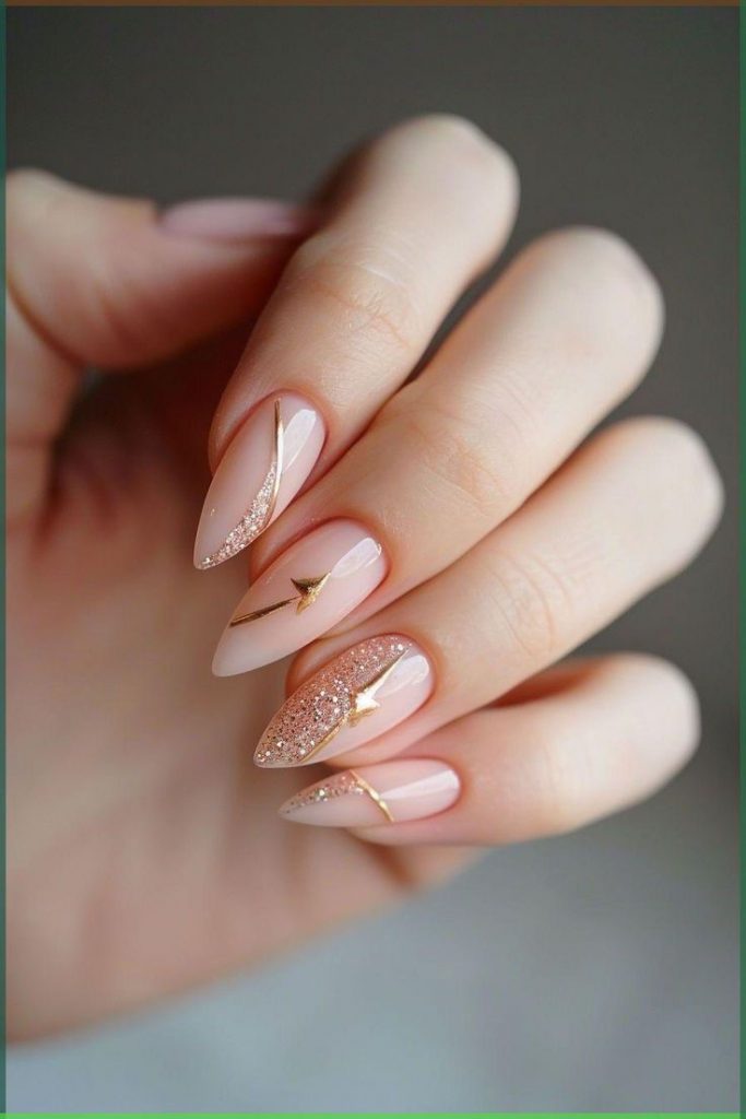 This design exudes luxury with its nude base adorned with sleek gold accents. The subtle art lines create a geometric yet elegant feel, ideal for formal events or weddings. The almond design ensures a cute and delicate look, suitable for all nail shapes and seasons.