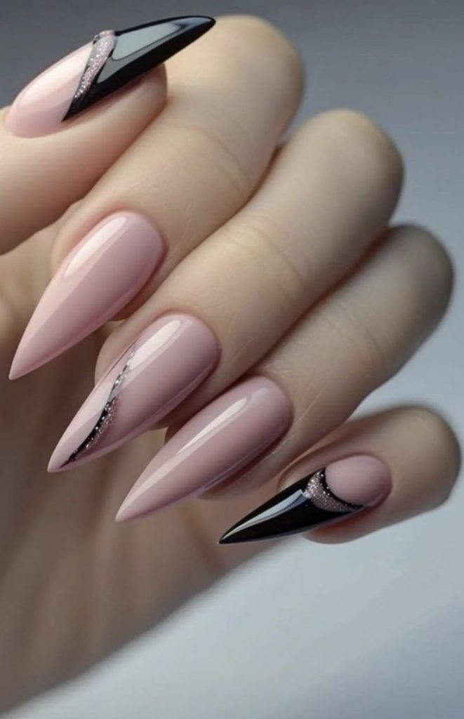 This striking coffin-shaped design features a neutral nude base contrasted with bold black tips. The delicate silver accents add a trendy touch, making it ideal for winter nights or office-friendly chic. This nail type suits fashion-forward individuals who love mixing minimalism with bold accents.
