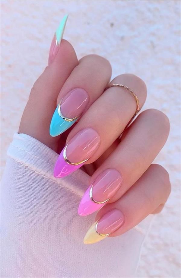 This design elevates the classic French tip with a trendy pastel rainbow twist. Ideal for those who love color but prefer subtlety, it’s perfect for transitioning from spring to summer. The delicate gold accents add sophistication, making it suitable for weddings or vacations.