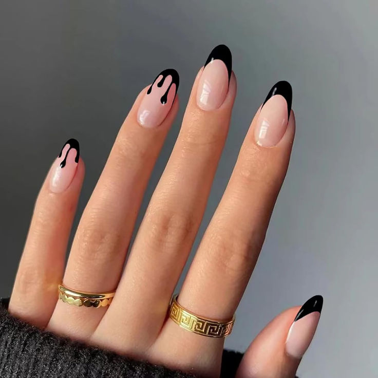 A daring yet minimalist take on spooky nails, this look combines nude bases with dripping black tips. Perfect for Halloween or the fall 2025 season, it’s a trendy way to express your dark side without going overboard.