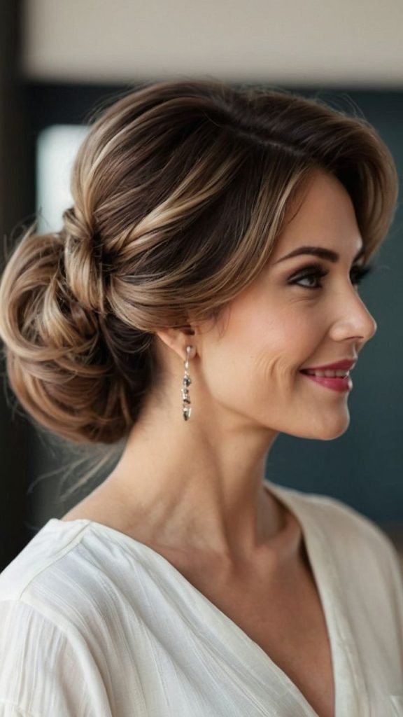 This soft and romantic twisted low bun is perfect for formal occasions such as weddings or family events. The twisted sections add texture and dimension, while the low placement gives it a polished yet relaxed vibe. It’s an ideal choice for wedding mothers or women with medium-length hair.