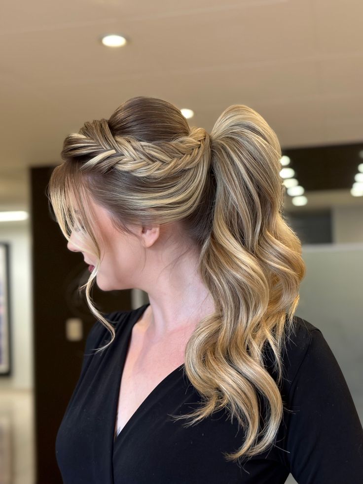 Create a fishtail braid along one side of your head, blending it into a ponytail. Curl the loose ends of the ponytail for added elegance. Secure the braid with pins to ensure it stays in place all day.